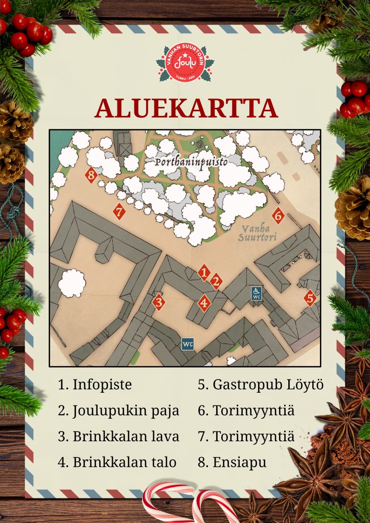 Vanhan Suurtorin joulun infopiste sijaitsee Vanhan Raatihuoneen ja Brinkkalan talon kulmassa Vanhalla Suurtorilla lähellä joulurauhan julistusparveketta.